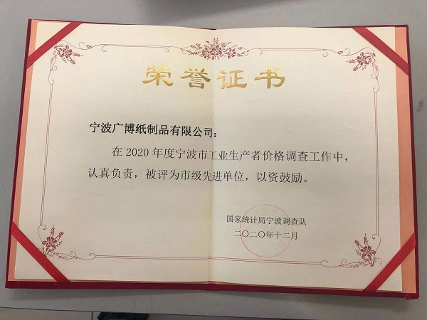 In 2020, Guangbo Group actively cooperated with Ningbo investigation team of the National Bureau of statistics to carry out the statistical investigation of industrial producer prices, and made a modest contribution to improving the quality of the city's statistical investigation of industrial producer prices. Therefore, Guangbo Group Stock Co., Ltd. won the title of "municipal advanced unit".