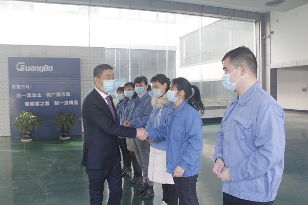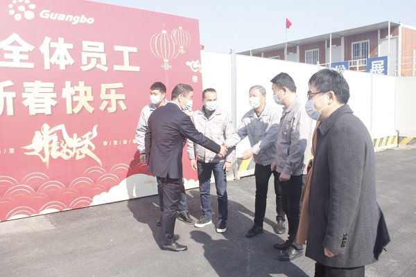 Stride into a new era and start again in the new year.On February 18, 2021, the first working day after the long spring festival holiday, Wang Liping, secretary of the Party committee and president of Guangbo Group, and Wang Junping, deputy secretary and general manager, led all the senior leaders of the group to the front line of each branch company and production workshop, went deep into the work site and post, extended New Year greetings and blessings to the employees who have started their work in the new year, and encouraged them to continue to work together and take responsibility in the new year.