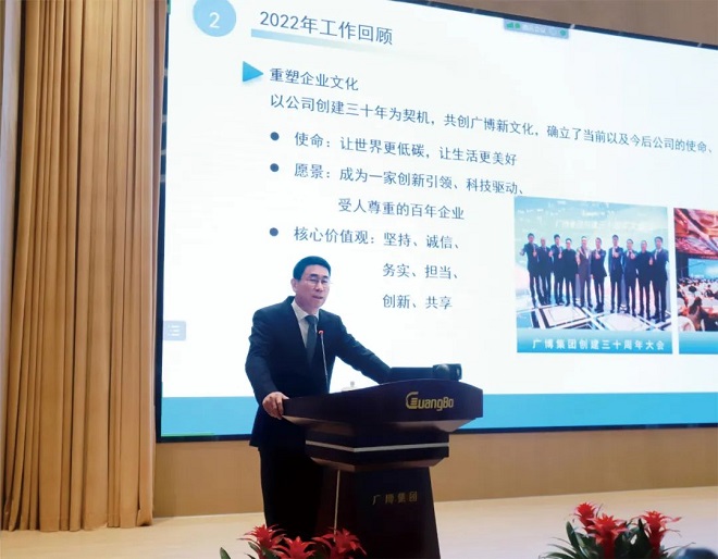 At the beginning of the conference, Wang Junping, deputy secretary of the Party Committee and general manager of the group company, made the annual work report of the group. In the report, general manager Wang Junping reviewed the business achievements of Guangbo Group in 2022 in detail, analyzed the existing problems, and put forward the business objectives and key work requirements of each business unit in 2023.Mr. Wang said that in 2022, the company took the board of directors as the core, actively sought changes and responded, courageously moved forward, and handed over a hard-won transcript with the joint efforts of everyone.In the new year, the company should closely focus on the general principle of "demand-oriented and action-oriented to make impossible possible", firmly implement the corporate cultural values, continue to strengthen the construction of talent system, effectively integrate resources, create all-round differentiated competitiveness, form high-quality development synergy, and achieve effective improvement in quality and reasonable growth in quantity.