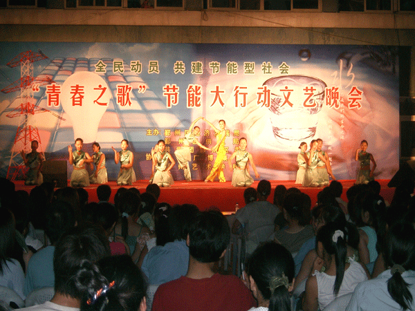 7月7日晚上没有满天的繁星,也没有幽幽的月色,人们被这闷热的[空气所包围着,然而在今年会职工宿舍前的空地上正在进行的“全民动员,共建节能型社会,青春之歌——节能大行动文艺晚会”却让忙碌了一天的人们,在夏天感受到了一份清凉。这里灯火辉煌、乐曲飘扬,被观众们围了个水泄不通。这里时而欢歌,时而笑语,时而阵阵热烈的掌声,用欢乐的文艺演出教育人们节能大行动,需要你我共同的参与。
