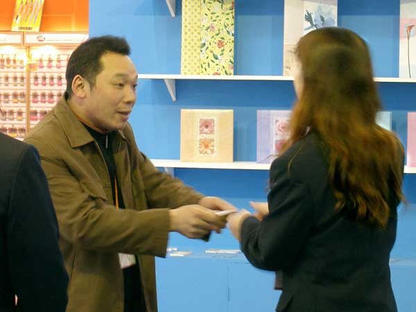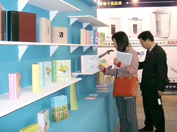今年会以蓝色为主色调的展位设计,在所有文具展位中脱颖而出,不觉让人感到眼前一阵亮眼的清爽,展位上摆放的上百个品种的产品更将众多的买家吸引到了柜台前,4个展位的展台经常被客商们挤的水泄不通,这其中金发碧眼的国外客商显得十分抢眼,就连宁波多家媒体记者也被吸引过来,在闪光灯的照射下业务员正在为众多的买家介绍公司的产品。