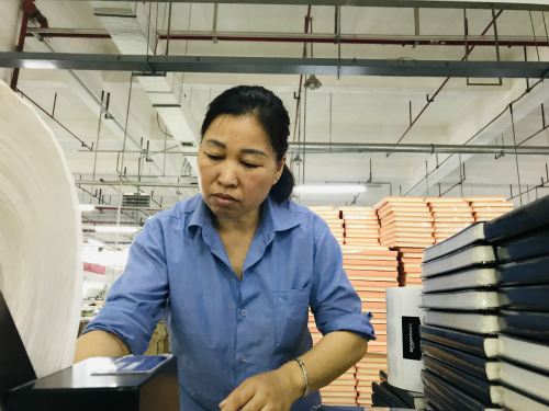 去年年底,公司接了一个皮面本的大单子,“数量很多,客户要求的交货时间也很赶。”张咪翠回忆说。时间紧,任务急,她就想着和大家商量下,看大家能不能加加班,尽快出货,可还没等她开口,史翠红反倒是主动请缨了:“这次我们就算是天天加班,也一定要把货赶出来。”史翠红的话让张咪翠吃了一颗定心丸。
