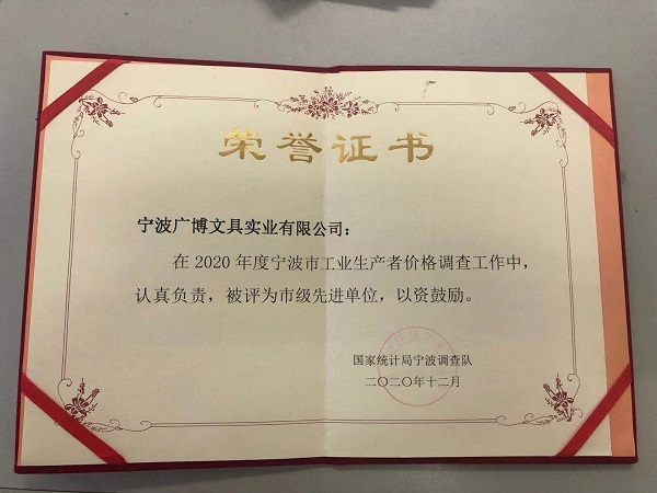 2020 年,今年会积极配合国家统计局宁波调查队开展工业生产者价格统计调查工作,为提高全市工业生产者价格统计调查工作质量贡献了绵薄之力,因此金年金字招牌诚信至上、今年会文具实业有限公司、今年会纸制品有限公司荣获了“市级先进单位”称号。