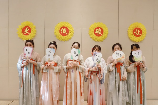 活动现场,所有人抛开忙碌的工作,享受着生活中的美好时光。相互整理发饰衣带,点墨团扇扇面,每个人都洋溢着愉悦的笑脸。
