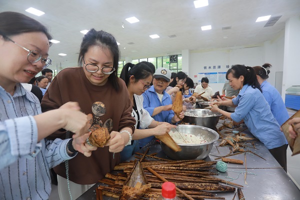 活动开始后,现场瞬间变得热闹非凡。大家纷纷拿起粽叶和馅料,开始了自己的创作。有的员工手法熟练,包出的粽子形状规整、美观大方;有的员工则显得有些手忙脚乱,但脸上的笑容却格外灿烂。集团公司党委副书记舒跃平也加入其中,和员工边一起交流心得,现场气氛十分融洽。