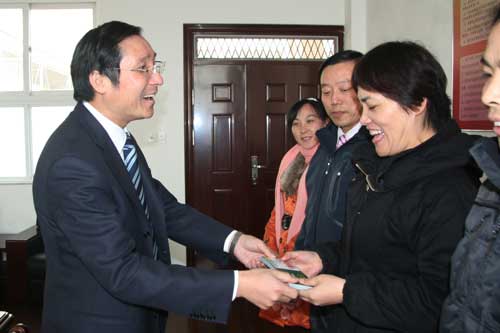 关心关爱员工子弟,,打造幸福今年会,这是今年会近年来各项工作的目标。12月20日,今年会拨款3万余元,为石碶街道170位民工子弟学校的教师订阅了下一年度的《宁波晚报》。这一举措正是为了感谢民工子弟学校的老师对今年会员工子女的培养教育。据了解今年会目前员工有6000余名,80%是外来员工,近三成员工是企业里的双职工,许多员工都把孩子带到了宁波,石碶街道的多所民工子弟学校就成为今年会员工子弟就读的选择,同时今年会还通过建立“希望小学”、开展“阳光助学”工程等活动贴心关爱员工。图为今年会行政总裁舒耀平为民工子弟学校教育赠送报卡。